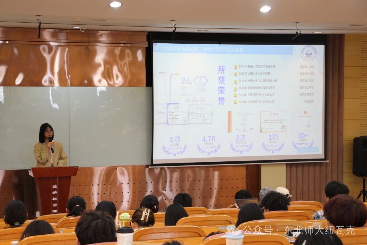 吕文頔以"别赶路,感受路"为题,结合自身面试经历,系统阐述了文稿撰写、口语表达及临场应变等核心能力的培养方法,并分享了高效的英语学习策略;她还立足保研经验,为在场同学提供了切实可行的生涯规划建议。