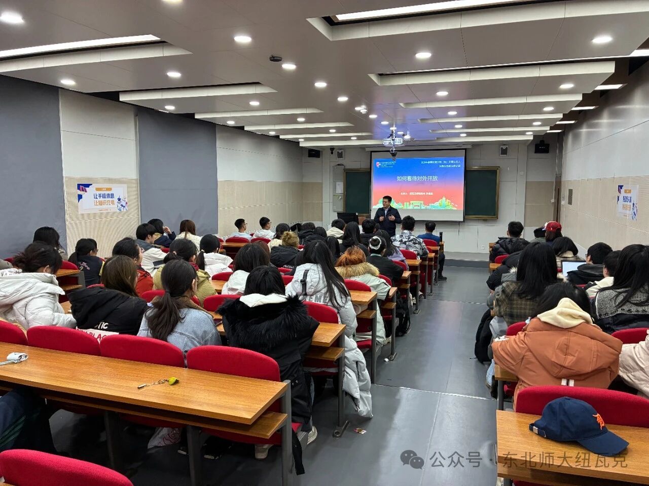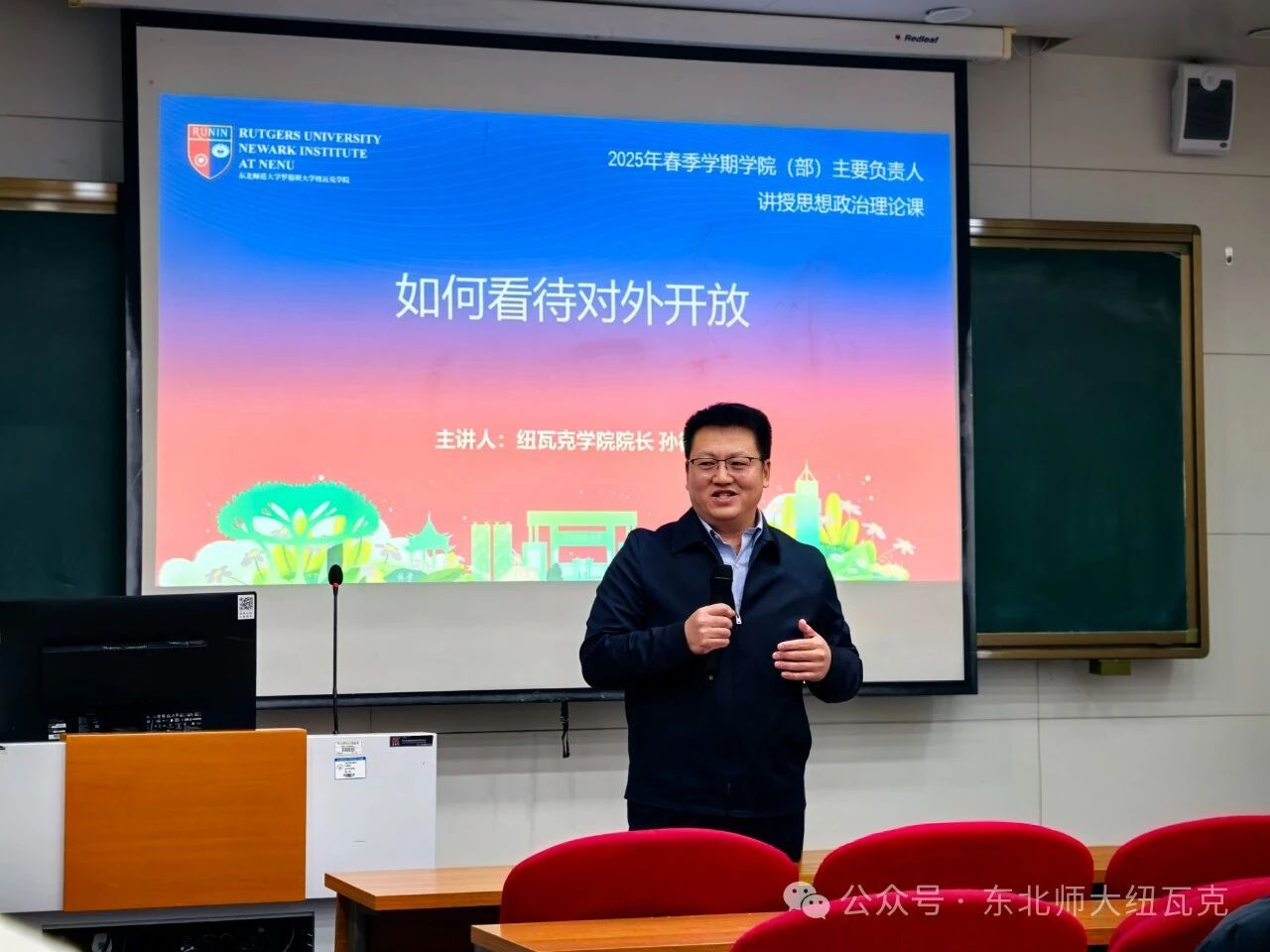 2025年3月19日,纽瓦克学院院长孙德胜为2024级金融专业本科生讲授了一堂题为"如何看待对外开放"的思想政治理论课。学院党总支书记郝明宇、办公室主任徐一渌、辅导员孙羽出席活动。